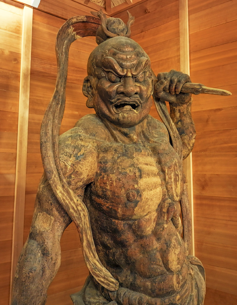 이 목조상은 금강역사, 즉 일본어로 곤고리키시의 모습을 묘사하고 있습니다. 이와 같은 조각상은 일본에 있는 많은 사찰의 출입문 옆에 있고, 일반적으로 니오(두 수호왕)라고 불립니다. 높이가 각각 3.58미터와 3.56미터인 다네지 사찰의 니오상은 일본의 대형 동상입니다. 이 조각상은 가마쿠라 시대(1185~1333년)에 제작되었고, 본래 다네지 사찰의 문 중 하나에 설치되었지만 나중에 조각상을 보존하기 위해 특별히 지어진 보물관으로 옮겨졌습니다. 두 수호신은 사실적으로 표현되어 있고, 상반신을 드러낸 채 강렬한 기운을 뿜어냅니다. 수호신의 눈빛에서는 분노가, 자세에서는 압도적인 힘이 느껴집니다.